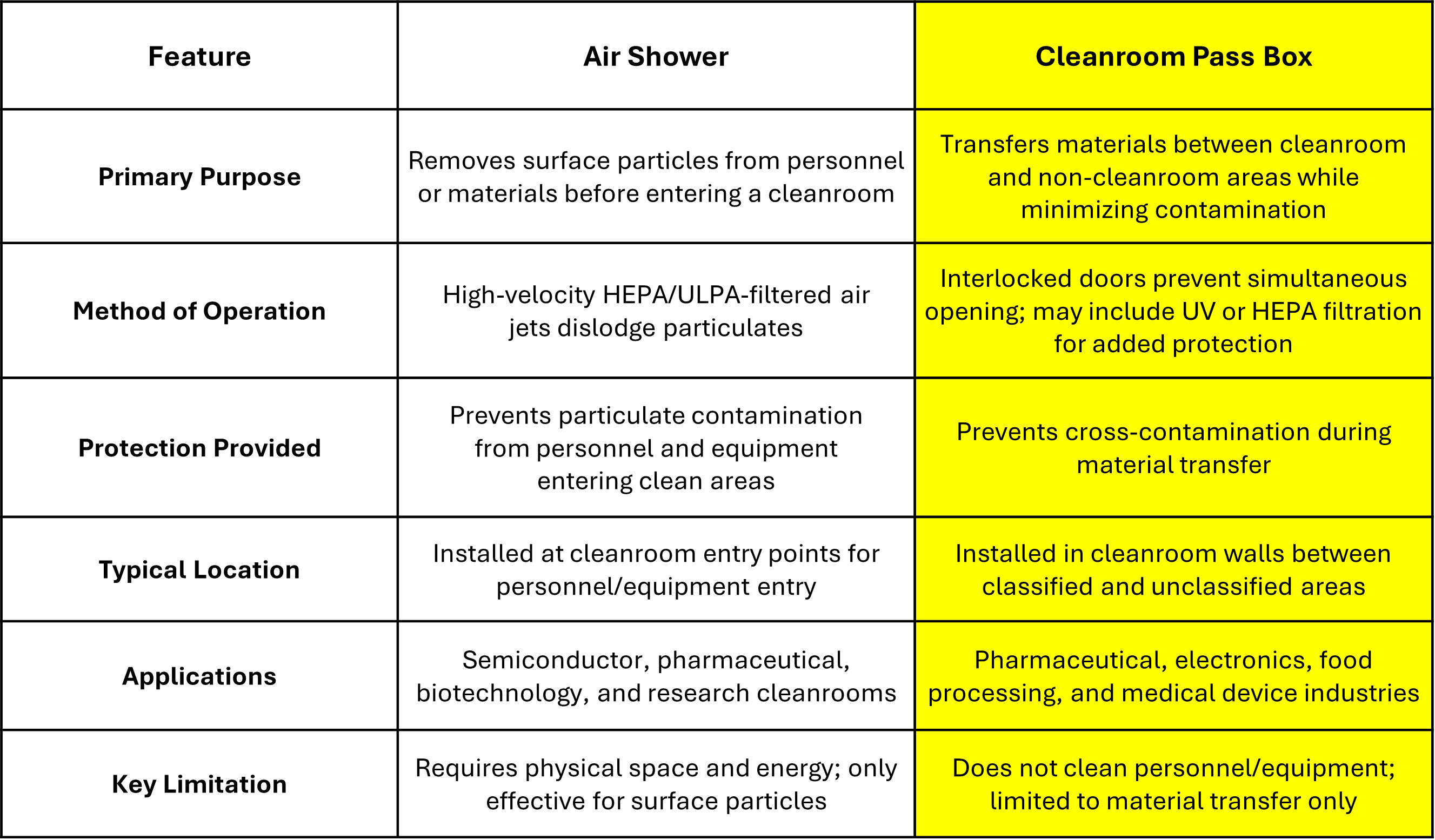 A pass box is a controlled transfer chamber designed to move materials between cleanroom and non-cleanroom areas while minimizing the risk of contamination. It is typically equipped with interlocked doors to prevent simultaneous opening and may incorporate HEPA filtration or UV sterilization for added protection. Pass boxes are widely used in pharmaceutical, biotechnology, semiconductor, and food processing facilities to maintain cleanroom integrity and reduce cross-contamination during material transfer.