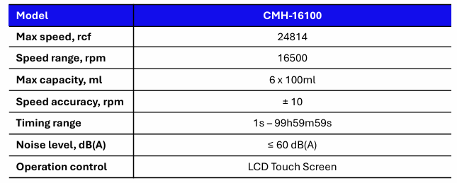 • Max speed at 16500 rpm/ 24814 xg (depends on rotor)